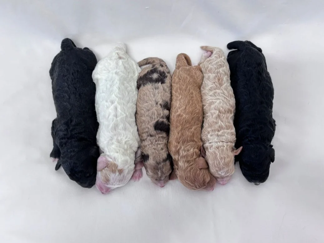 Kuddles and Tug’s puppies have arrived! They are F1b Tiny Goldendoodles. They are such a lovely bunch! They will have amazingly soft curly coats that will be perfect if you have allergies! Kuddle's gorgeous puppies, will be vet checked, de-wormed, treated with Revolution, Microchipped, and come with a 2 year written guarantee. They will be shampooed, groomed and will have a nice puppy pack to go home with. Should you have any questions we be there to help you decide on the perfect puppy for you. We love our dogs and they enjoy living in a new state of the art facility where they can run and play and where they are pampered, shampooed and groomed. You will love a puppy from Kuddle’s with such a wonderful laid back temperament. If you are interested in one of Kuddle’s puppies please fill out the online application and send in your deposit you will be added to the list in the order that we have received the deposits for this mating. We will email you and book your appointment to come choose your puppy in the order that we have received the deposits. We look forward to meeting you!